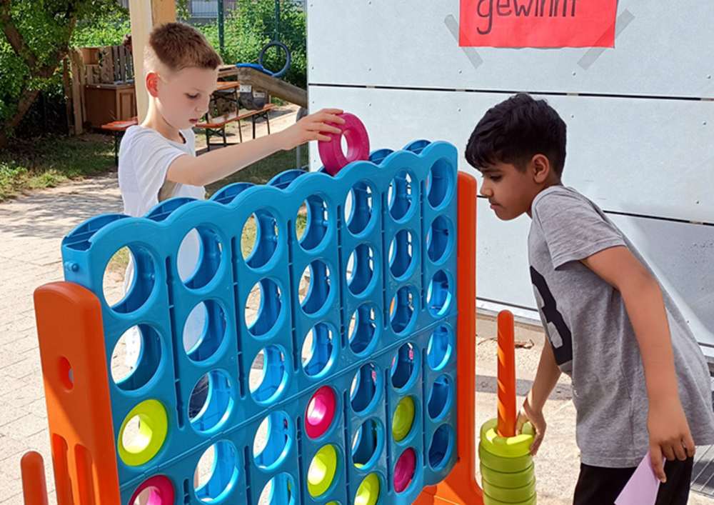 Anschließend konnten Kinder und Erwachsene an verschiedenen Spielstationen ihre Geschicklichkeit und Schnelligkeit unter Beweis stellen: Rollenrutsche, Dosenwerfen und Bobbycar-Rennen sorgten für Spaß und beste Stimmung. Bereits nach zwanzig Minuten ausverkauft waren die Lose der Tombola, unter denen es keine Nieten gab. Für das leibliche Wohl war mit Kuchen, Pommes und Bratwurstsemmeln gesorgt. Außerdem wurden unter den Schülerinnen und Schülern diejenigen geehrt, die beim Leseförderprogramm Antolin besonders viele Punkte gesammelt hatten.
