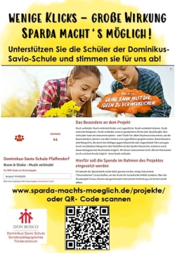Die Dominikus Savio Schule hat sich mit dem Musikprojekt „Boom & Shake“ beim Wettbewerb „Sparda macht's möglich“ beworben. Mit einem Handy und ein paar Klicks können Sie dazu beitragen, dass unser Projekt Fördergelder bekommt!