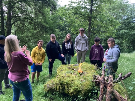 Der zweite Tag startete mit einem ausgiebigen Frühstück. Man munkelt, dass einige Schülerinnen und Schüler bereits davor die Kneippanlage in Anspruch nahmen. Gut gestärkt ging es in die nächste Phase der Workshops. Einer fand am Vormittag statt, der zweite am Nachmittag lediglich unterbrochen von einer verregneten Mittagspause mit leckerem Mittagessen und einem Ausflug zum Edeka. Den Abend hatte die Klasse für sich zur freien Verfügung. Bei Lagerfeuer mit Stockbrot und Marshmallows wurde bis spät abends geratscht, gelacht, Späße gemacht, aber auch das ein oder andere ernste Thema geteilt und beredet.